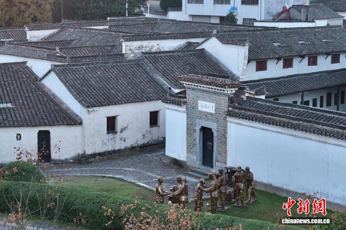 11月19日,安徽泾县的新4军军部原址摆设馆院内乱的雕刻。新4军军部原址留念馆位于安徽宣乡泾县云岭镇,现存年夜礼堂等11处原址,经由过程本状陈设取博题铺览,表现新4军正在云岭时代的战争取死活场景。(无人机相片)中新社记者 韩苏本 摄